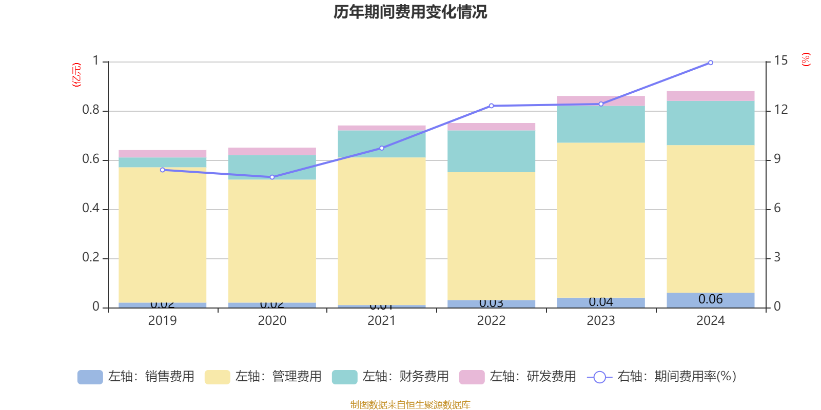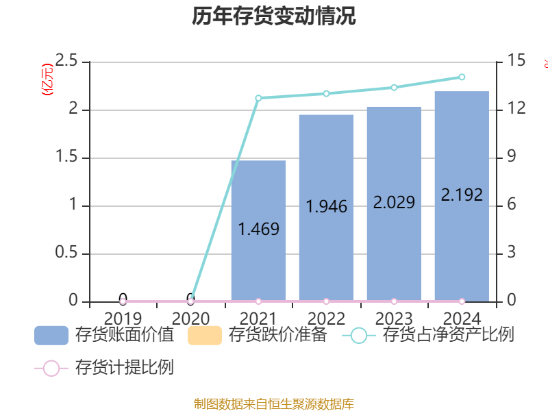 从存货变动来看,截至2024年末,公司存货账面价值为2.19亿元,占净资产的14.04%,较上年末增加1634.44万元。公司本期没有计提存货跌价准备。