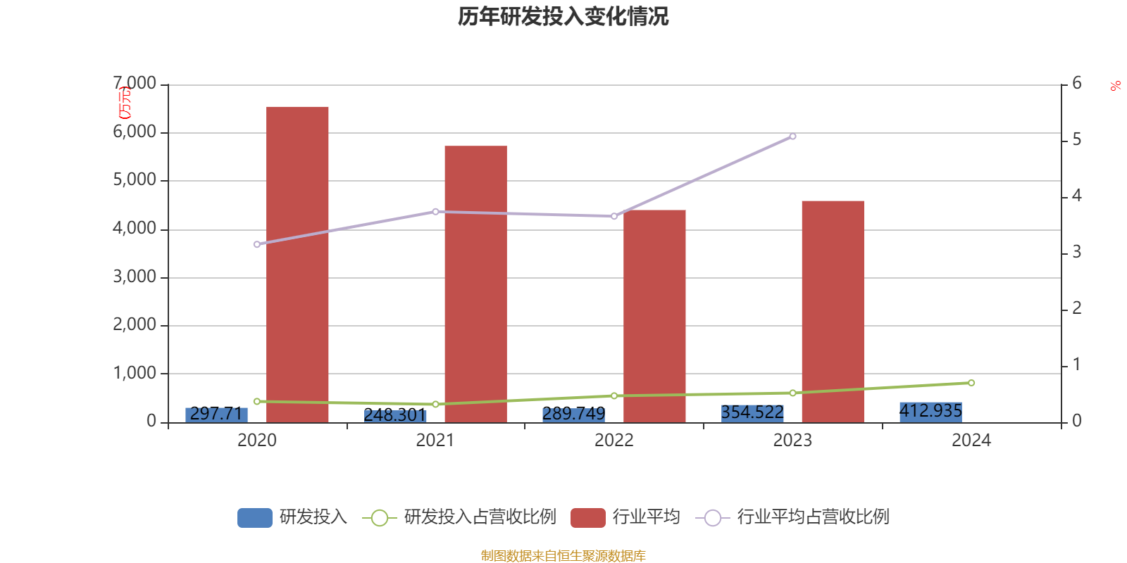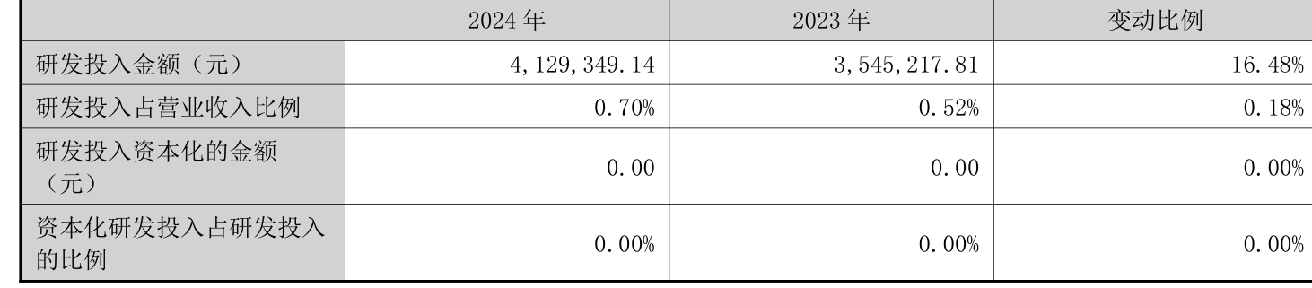 2024年全年,公司研发投入金额为412.93万元,同比增长16.48%;研发投入占营业收入比例为0.7%,相比上年同期上升0.18个百分点。此外,公司全年研发投入资本化率为0%。
