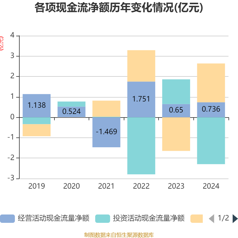 截至2024年,公司经营活动现金流净额为7362.78万元,同比增长13.3%;筹资活动现金流净额1.9亿元,同比增加3.55亿元;投资活动现金流净额-2.3亿元,上年同期为1.21亿元。