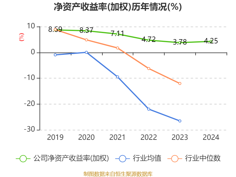 数据显示,2024年公司加权平均净资产收益率为4.25%,较上年同期上升0.47个百分点。公司2024年投入资本回报率为3.95%,较上年同期上升0.27个百分点。