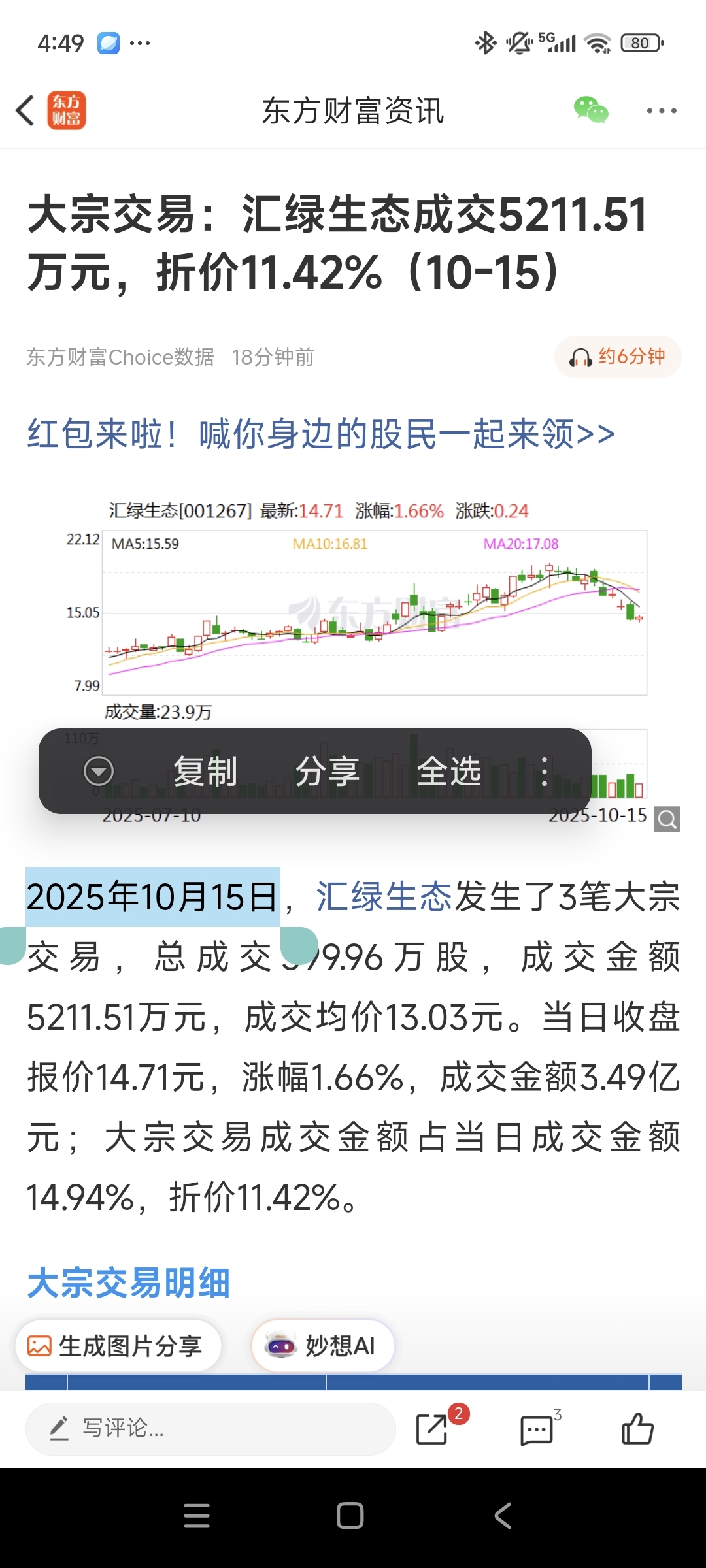 $汇绿生态(SZ001267)$ 明天可以跌停给我买一点吗