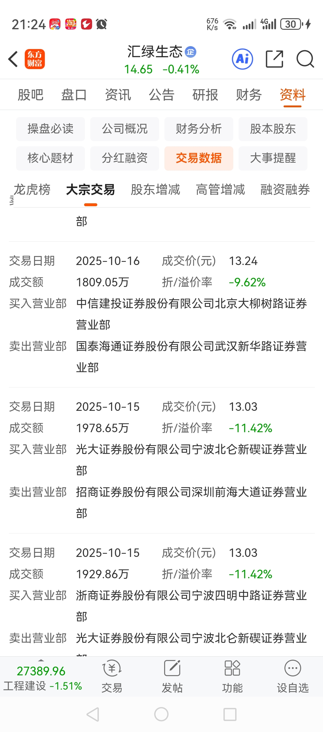 $汇绿生态(SZ001267)$ 已经连续两天折价大宗交易。看不懂,这个位置应该算低了吧
