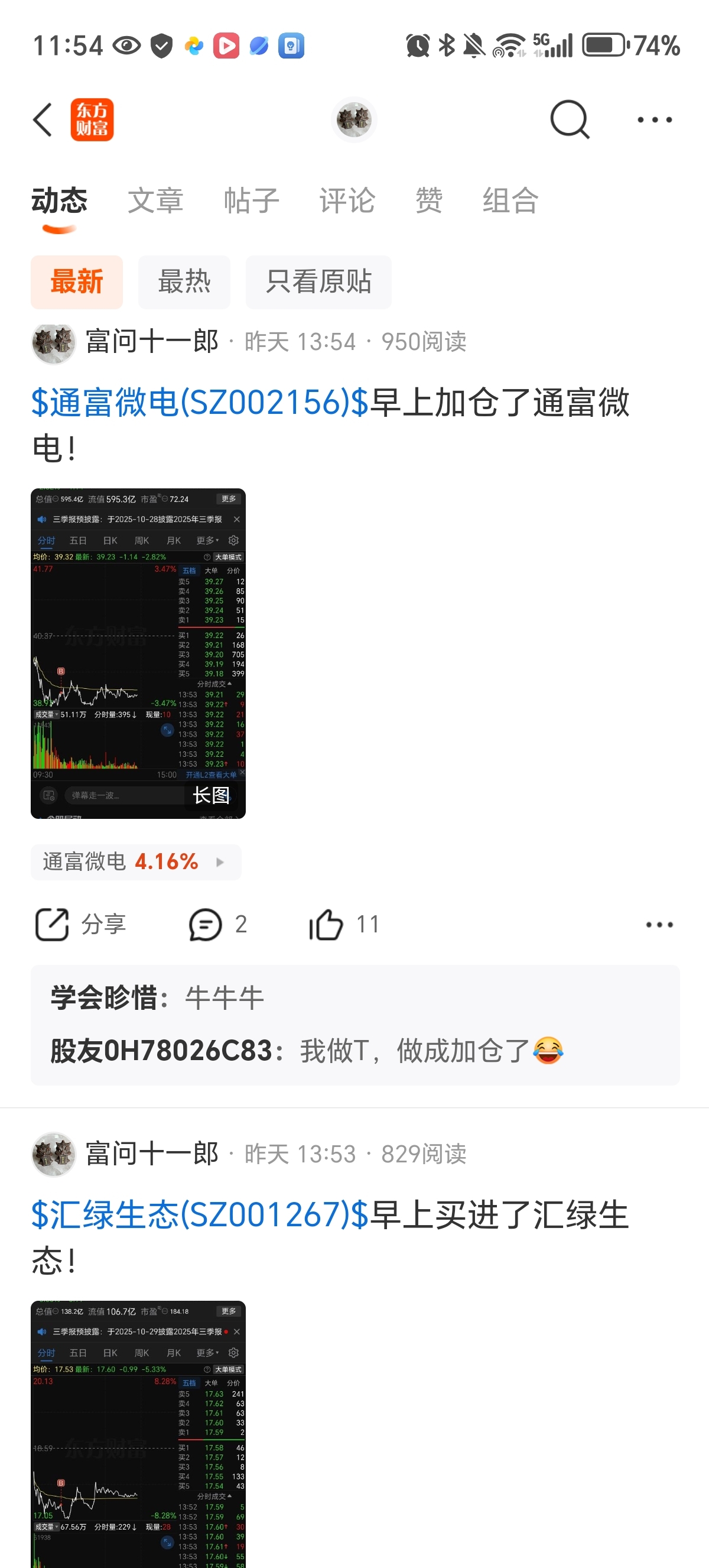昨天早上全面买进了通富微电,剑桥科技,汇绿生态,自提一个汇绿生态涨停,其它两个也