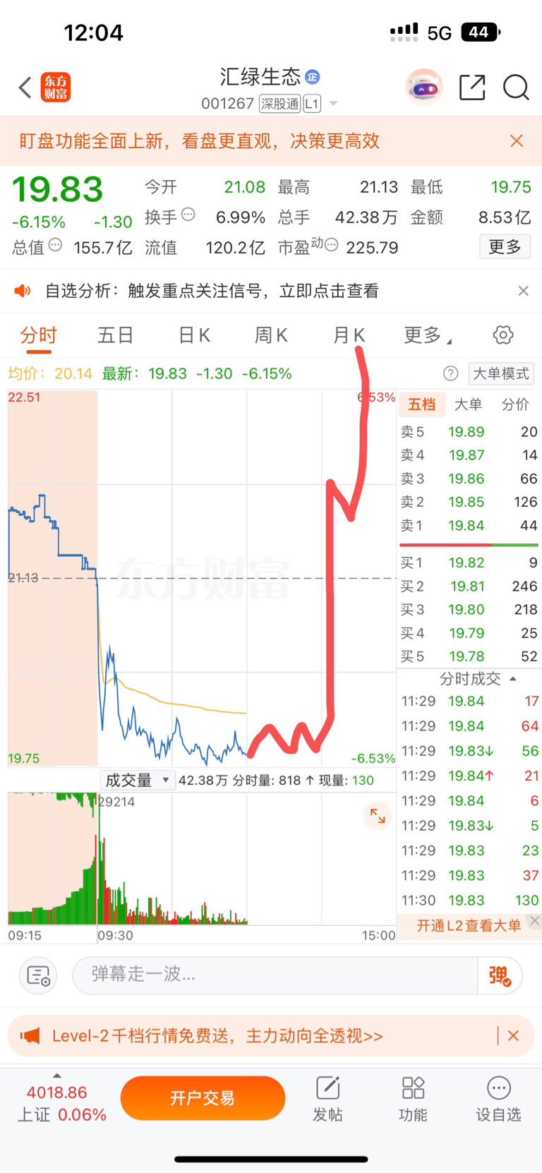 $汇绿生态(SZ001267)$ 虽然没买,但还是预测一下