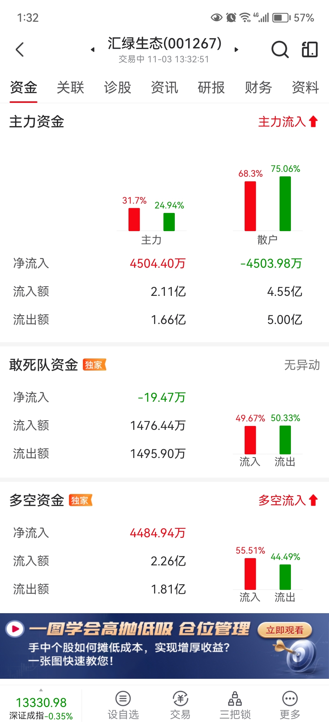$汇绿生态(SZ001267)$ 朱莉筹码吸舒服了,开始流入资金了。