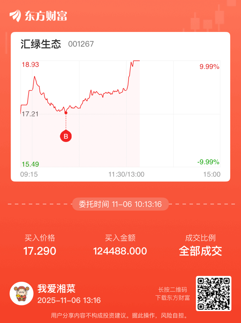 $汇绿生态(SZ001267)$ 吃饱了,感谢主力!!!