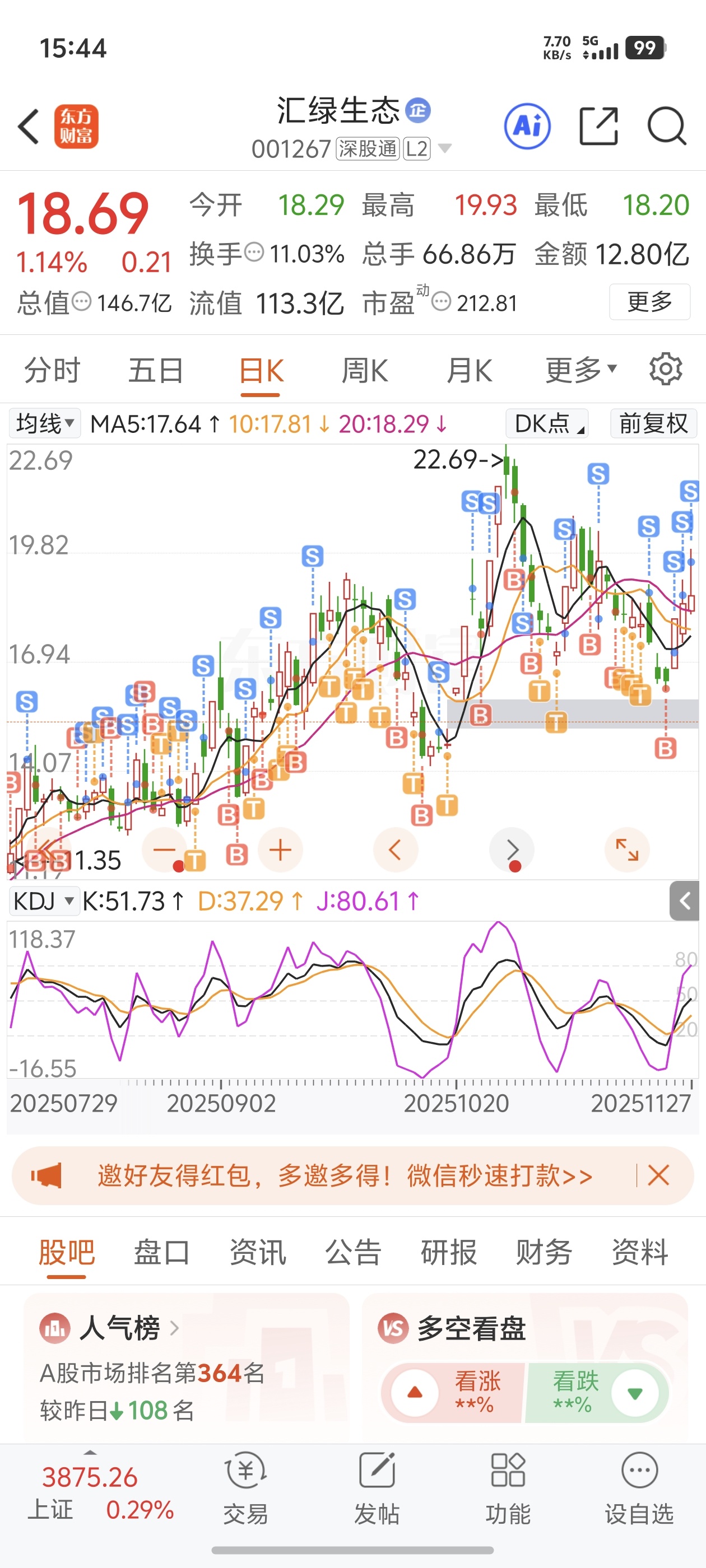 $汇绿生态(SZ001267)$ 明天18能买回来嘛。连续两天高抛。今天19.7抛了一半。明天疯狂低吸