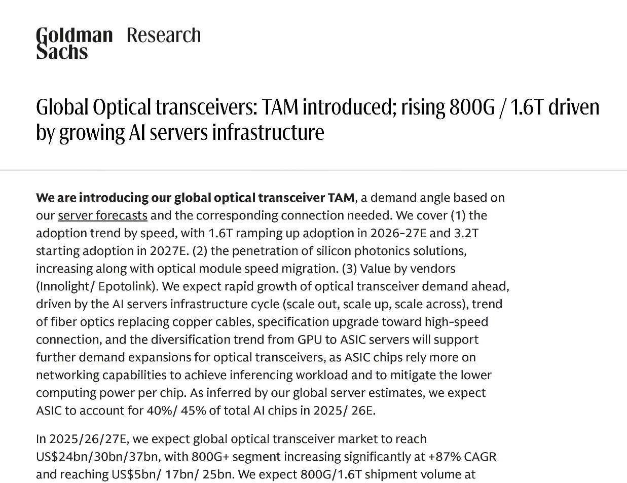 高盛最新:2027年光模块潜在市场规模2610亿,800G/1.6T需求快速增长