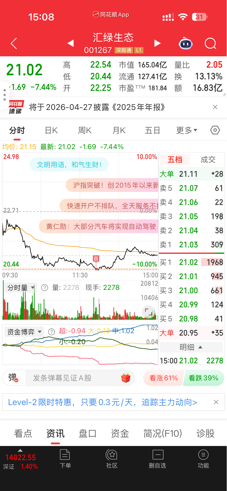 $汇绿生态(SZ001267)$ 全仓进来了,20.48全仓买进,事出反常必有妖,你们突然来了个大跌害怕有雷但是我非要和你们反着来,明天最少涨7-8个点