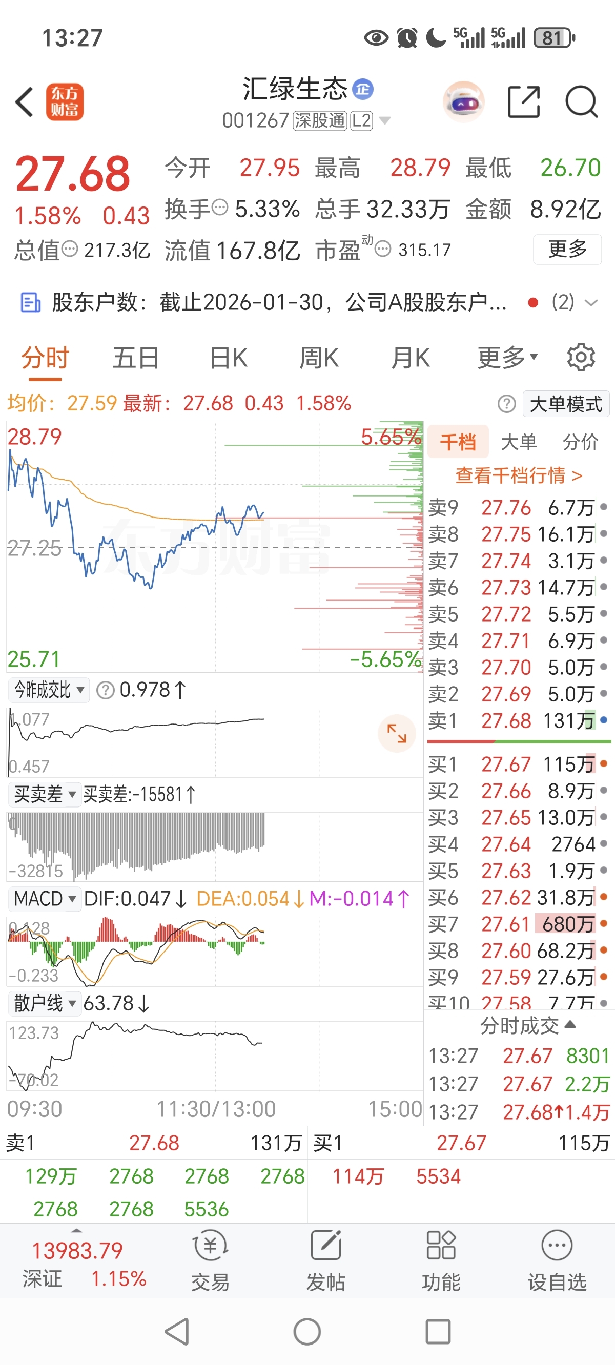 $汇绿生态(SZ001267)$ 全仓,今天一点没动