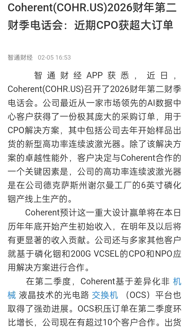 Coherent(COHR.US)2026财年第二财季电话会:近期CPO获超大订单
