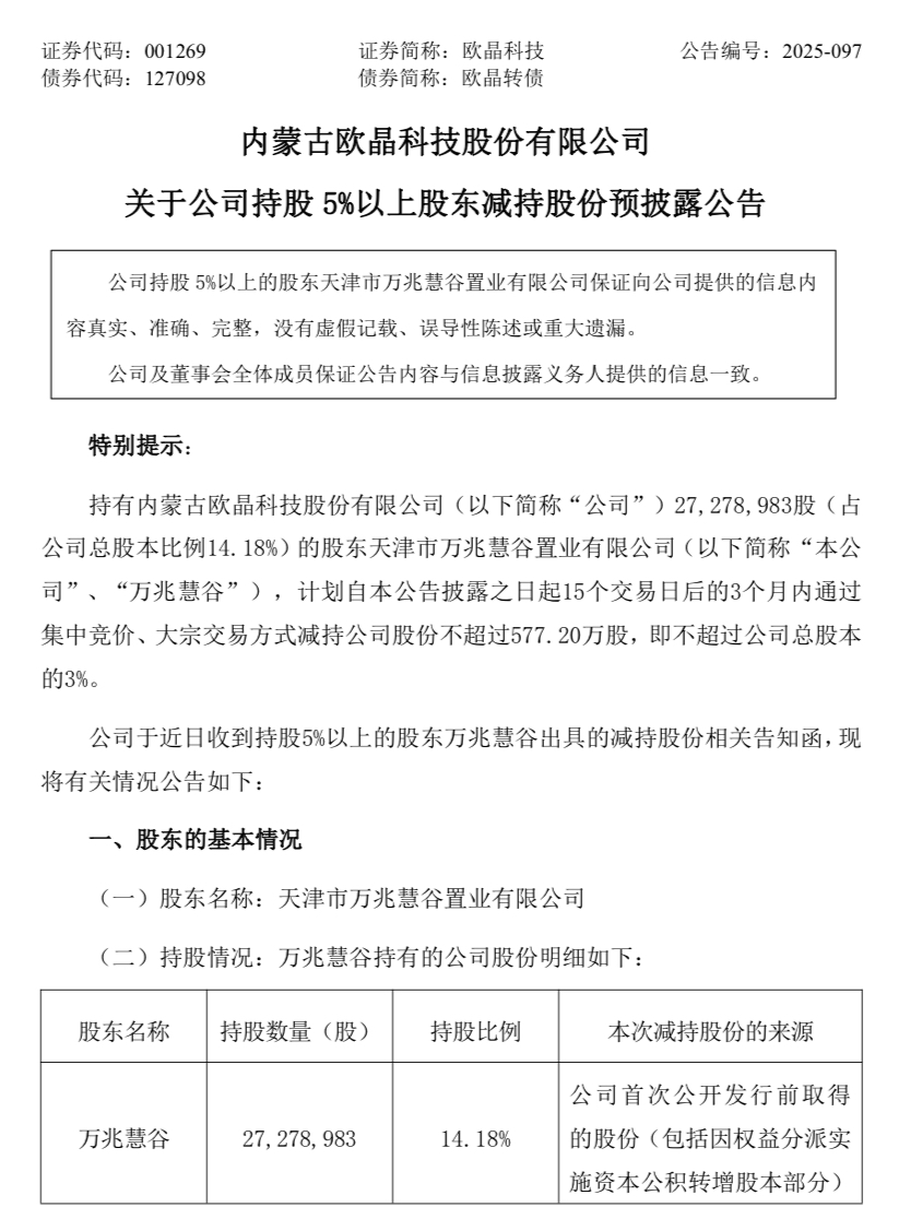 12月5日,欧晶科技(001269)发布公告,持股5%以上股东天津市万兆慧谷置业有限公司因自身经营需要,计划自公告之日起15个交易日后的3个月内(即2025年12月29日至2026年3月28日)通过集中竞价和大宗交易方式减持不超过577万股,约占公司总股本的3%。