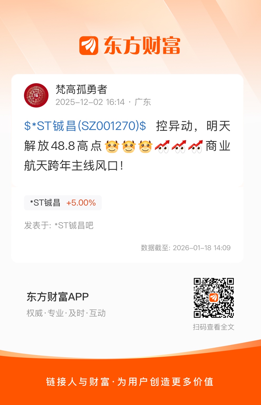 $*ST铖昌(SZ001270)$  控异动,明天解放48.8高点商业航天跨年主线风口!