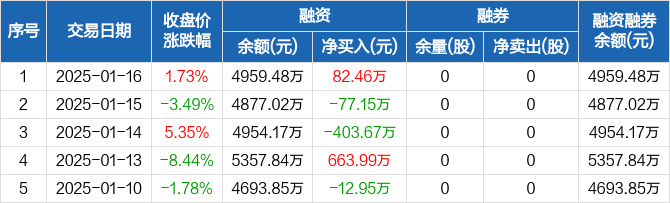 速达股份:融资净买入82.46万元,融资余额4959.48万元(01-16)