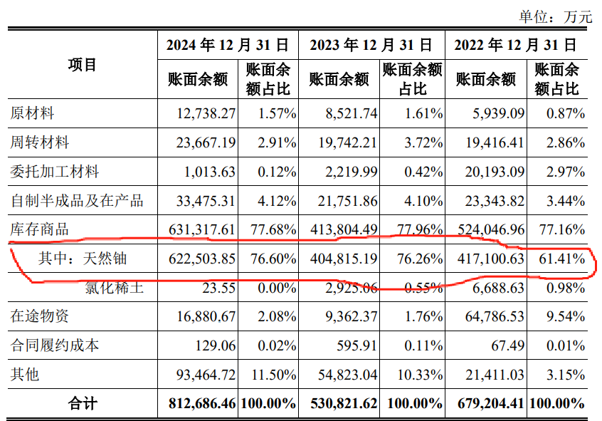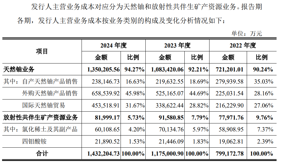 天然铀是公司收入主要来源,主要分为自产天然铀销售业务、外购天然铀产品销售业务和国际天然铀贸易业务。报告期,自产天然铀产品销售额分别为38.24亿元、34.46亿元和40.53亿元,外购天然铀产品销售额分别为30.74亿元、62.75亿元和72.23亿元,国际天然铀贸易业务分别为22.97亿元、35.14亿元和46.21亿元,后两者收入相加分别为53.71亿元、97.89亿元和118.44亿元,至2024年占营收之比已超过三分之二。