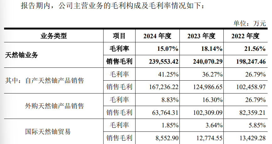 类似地,国际天然铀贸易业务也属于贸易业务,是购销均在境外的贸易业务。报告期,该业务毛利率分别为5.85%、3.64%和1.85%,毛利额分别为1.34亿元、1.28亿元和0.86亿元。