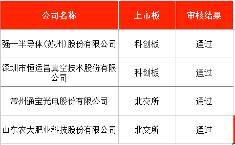 其中,拟在科创板IPO的强一半导体(苏州)股份有限公司(下称“强一股份”)、深圳市恒运昌真空技术股份有限公司(下称“恒运昌”),以及拟在北交所IPO的常州通宝光电股份有限公司(下称“通宝光电”)、山东农大肥业科技股份有限公司(下称“农大科技”)均成功过会。