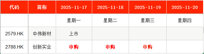 港股方面,Wind数据显示,本周(11月17日至11月21日)创新实业(02788.HK)将在周一至周三申购。