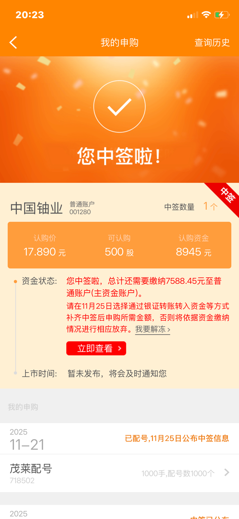 $中国铀业(SZ001280)$ 因为之前中签亏了钱,已经2年多没打新股了,这个二年多来第一次打还中了,能不能交款啊?有没有会估算的大师出来说说