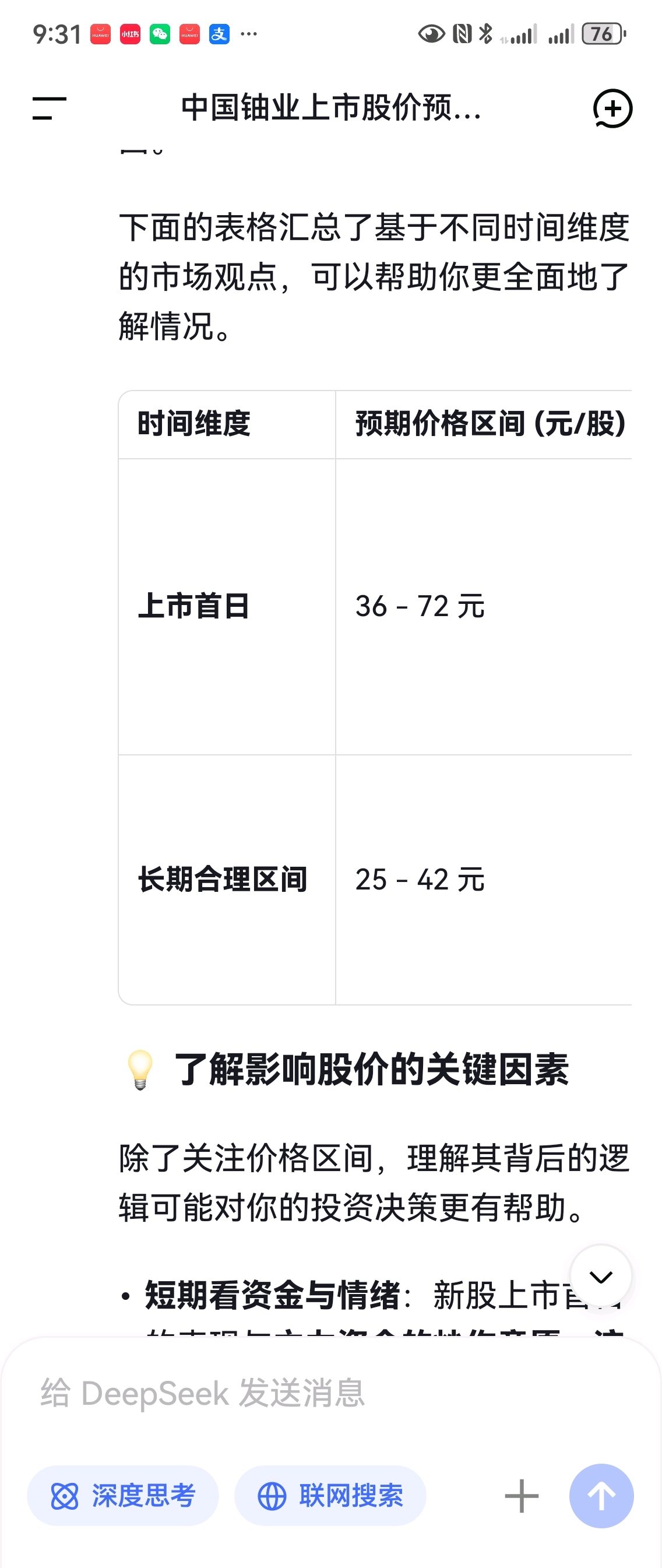 $中国铀业(SZ001280)$ 刚刚问了deepseek合理价格在36--72元之间