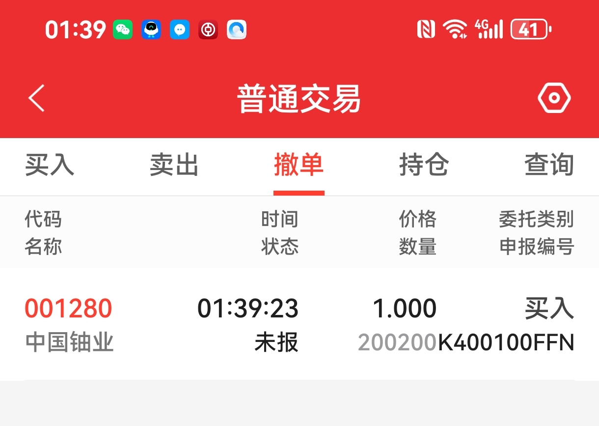 $中国铀业(SZ001280)$ 已委托下单买入。至少把集合竞价拉低点也行
