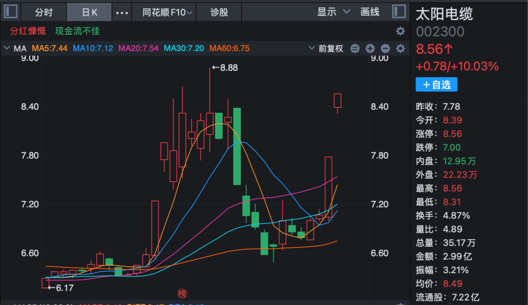 另外,福建板块反复活跃。太阳电缆涨停,走出2连板;闽东电力涨停;海通发展、实达集团、闽发铝业、漳州发展、厦门港务、中国武夷跟涨。