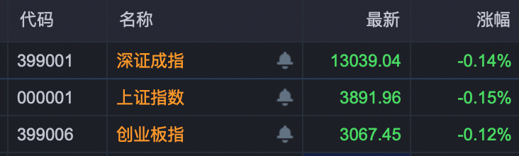 12月3日,三大指数开盘涨跌不一,截至发稿均已翻绿。盘面上,电池、房地产开发、贵金属、证券、家用轻工、培育钻石概念等板块开盘活跃;船舶制造、煤炭、商业百货、水泥建材、水产养殖概念等板块开盘走低。
