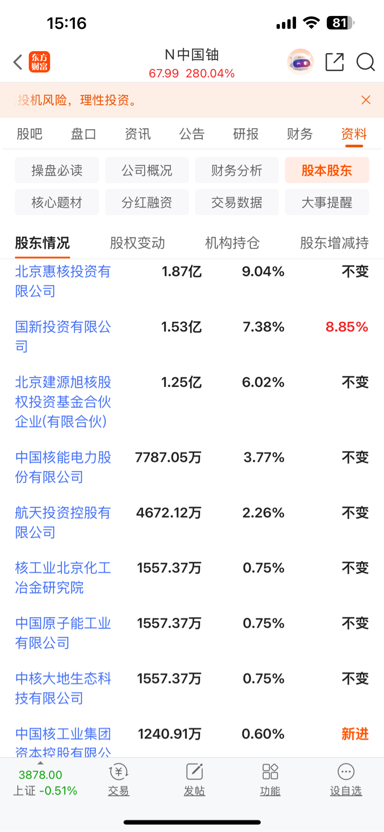 $N中国铀(SZ001280)$ 看看这些股东都是大佬,核聚变第一股,独一无二,明天大盘不乐观,冲上云霄$超捷股份(SZ301005)$