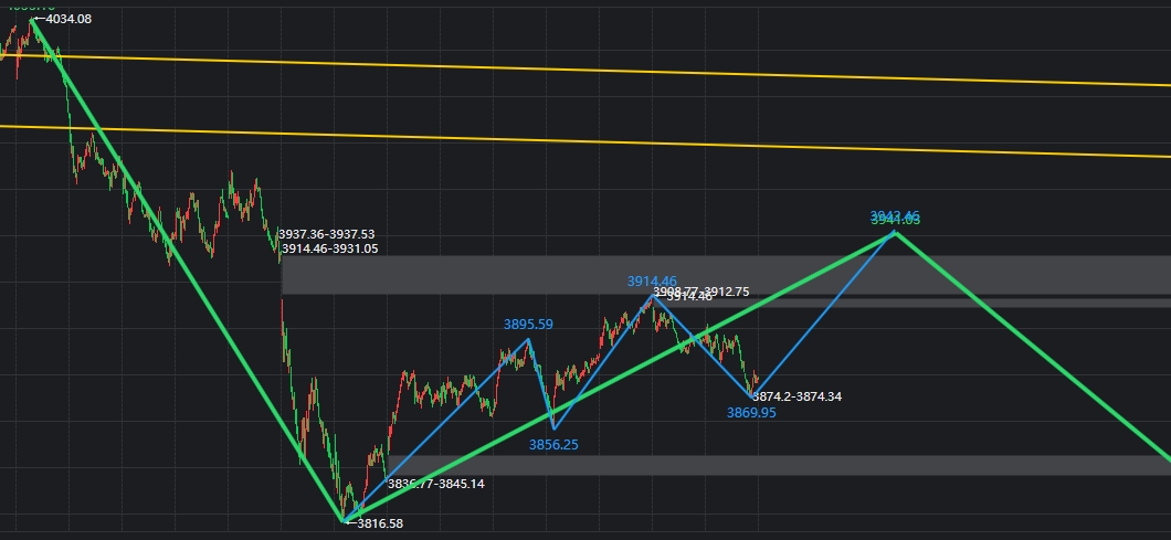 今天收盘,蓝4比蓝3的时间还长了,确实没有跌破3856,理应看强;再者,蓝4调整