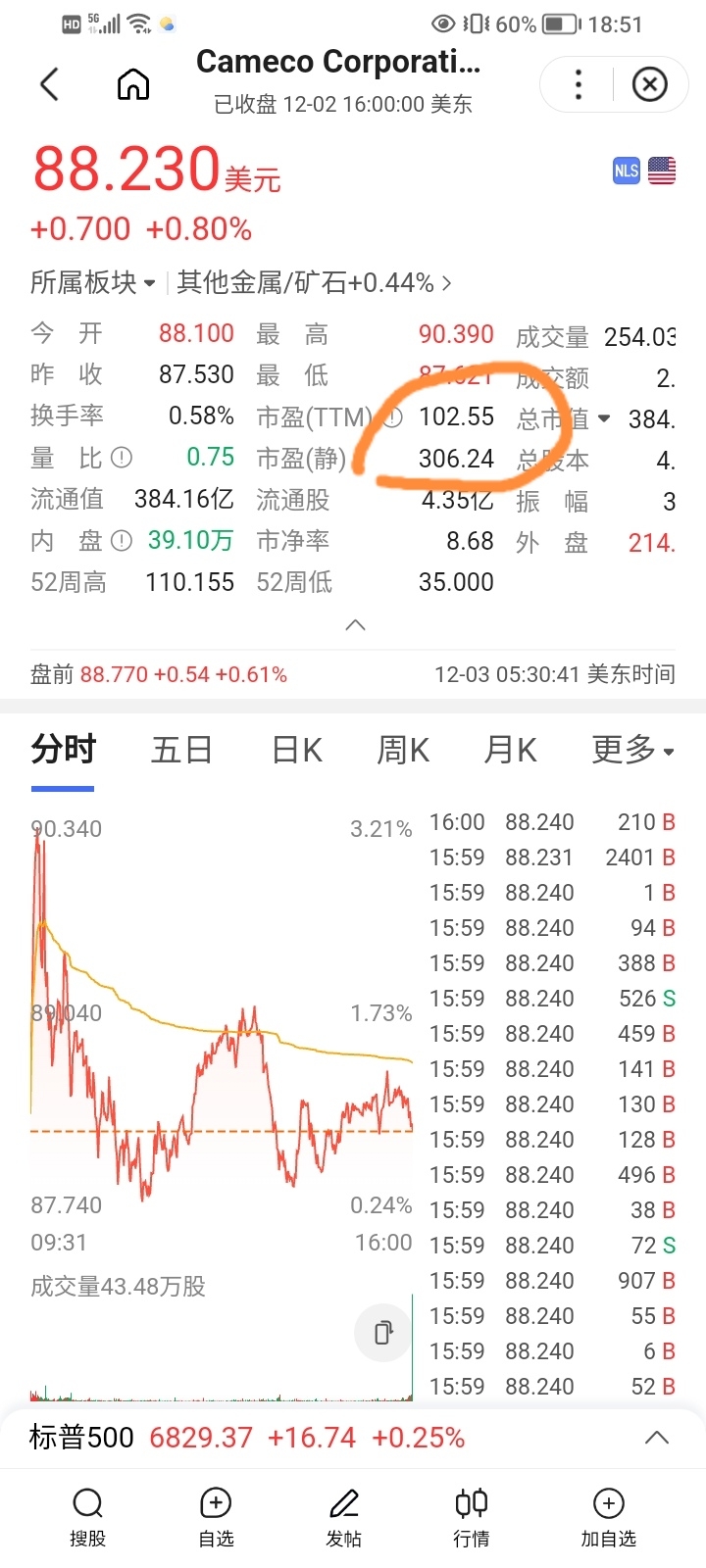 $N中国铀(SZ001280)$ 对比美股卡梅科,市盈率306