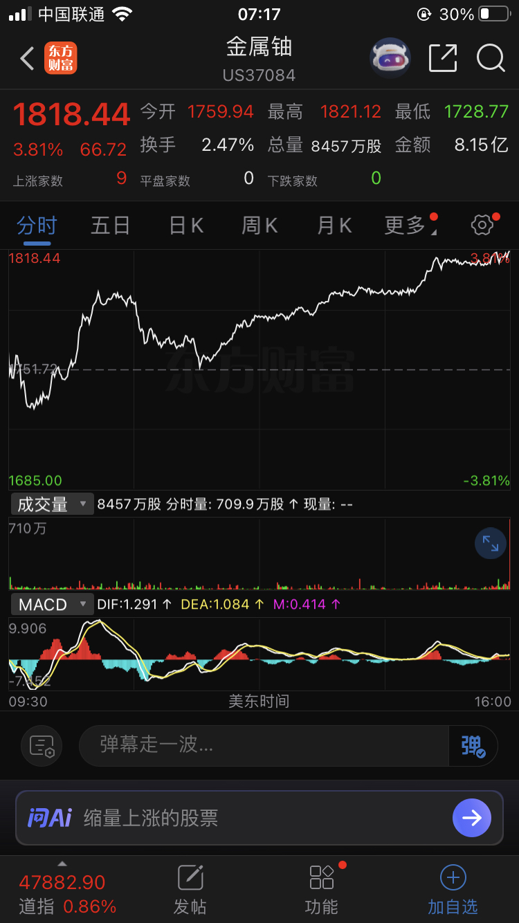 $N中国铀(SZ001280)$ 美股铀高开高走