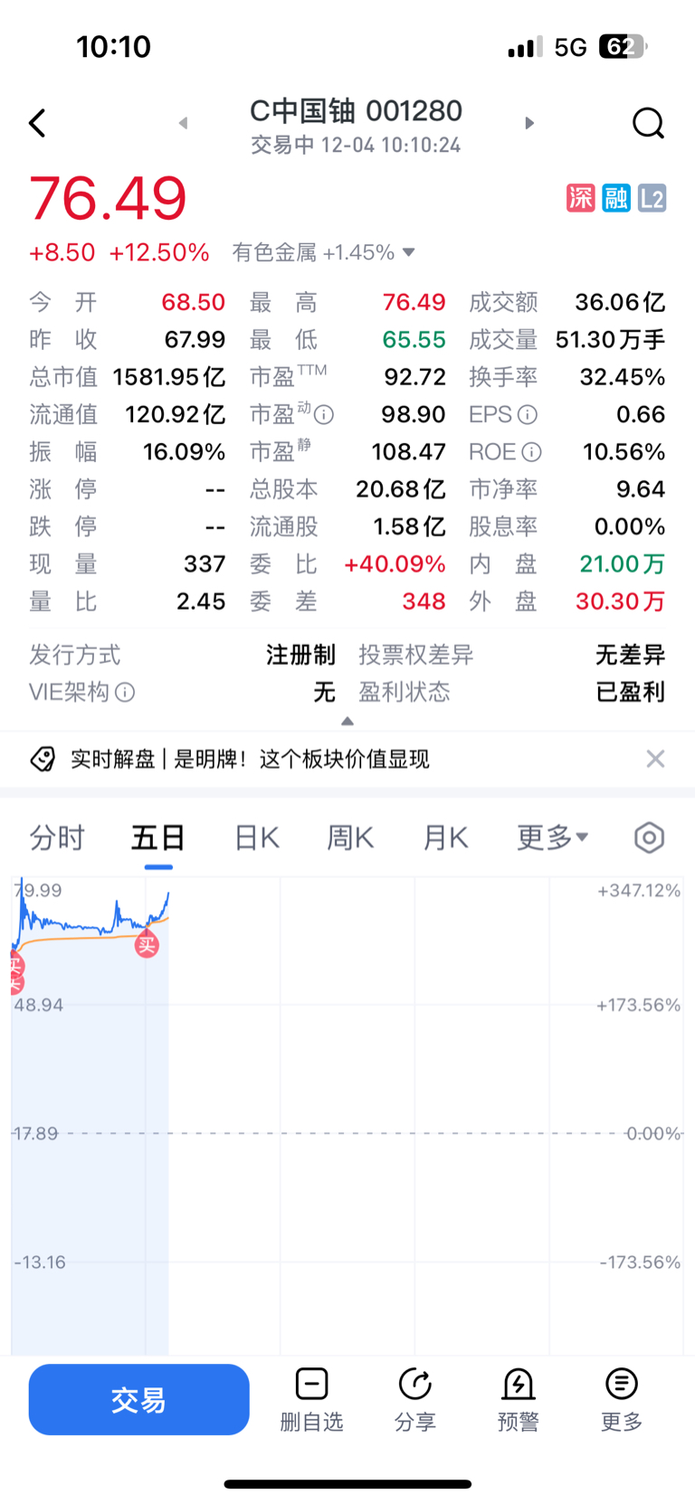 $C中国铀(SZ001280)$ 昨天的喷子呢?昨天最低进!今天也是最低进!现在还一股没卖坐等30个点左右的t