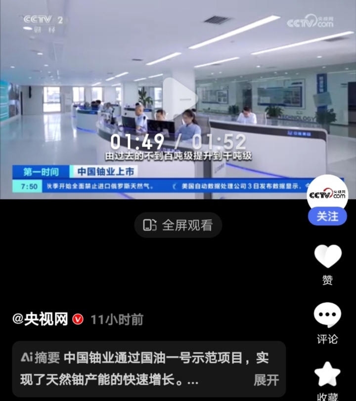 中国的铀资源高度依赖进口,对外依存度常年维持在70%以上。2023年,我国进口天然铀1.7万吨,主要来自哈萨克斯坦(1.1万吨)和纳米比亚(5734吨),还从俄罗斯进口了467吨的U-235浓缩铀、钚及其化合物为了保障铀安全,我国实行“多条腿”走路:一是实施“铀矿找矿”行动,今年1月,在鄂尔多斯盆地泾川地区取得铀矿找矿重大突破,资源储量规模达特大型;二是加大海外合作.