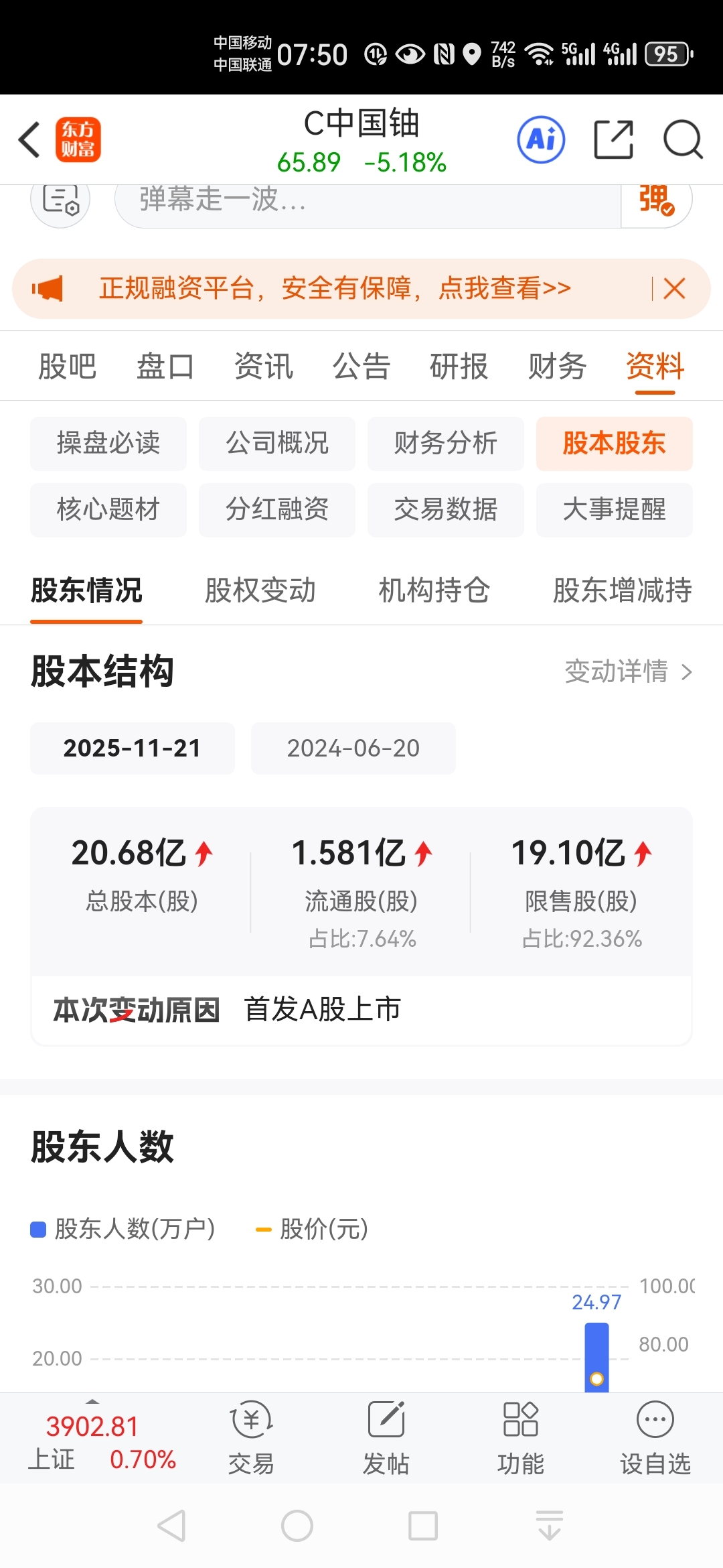 $C中国铀(SZ001280)$ 大家去查一下中间流通股这个数量有没有股价低于100的我看一下