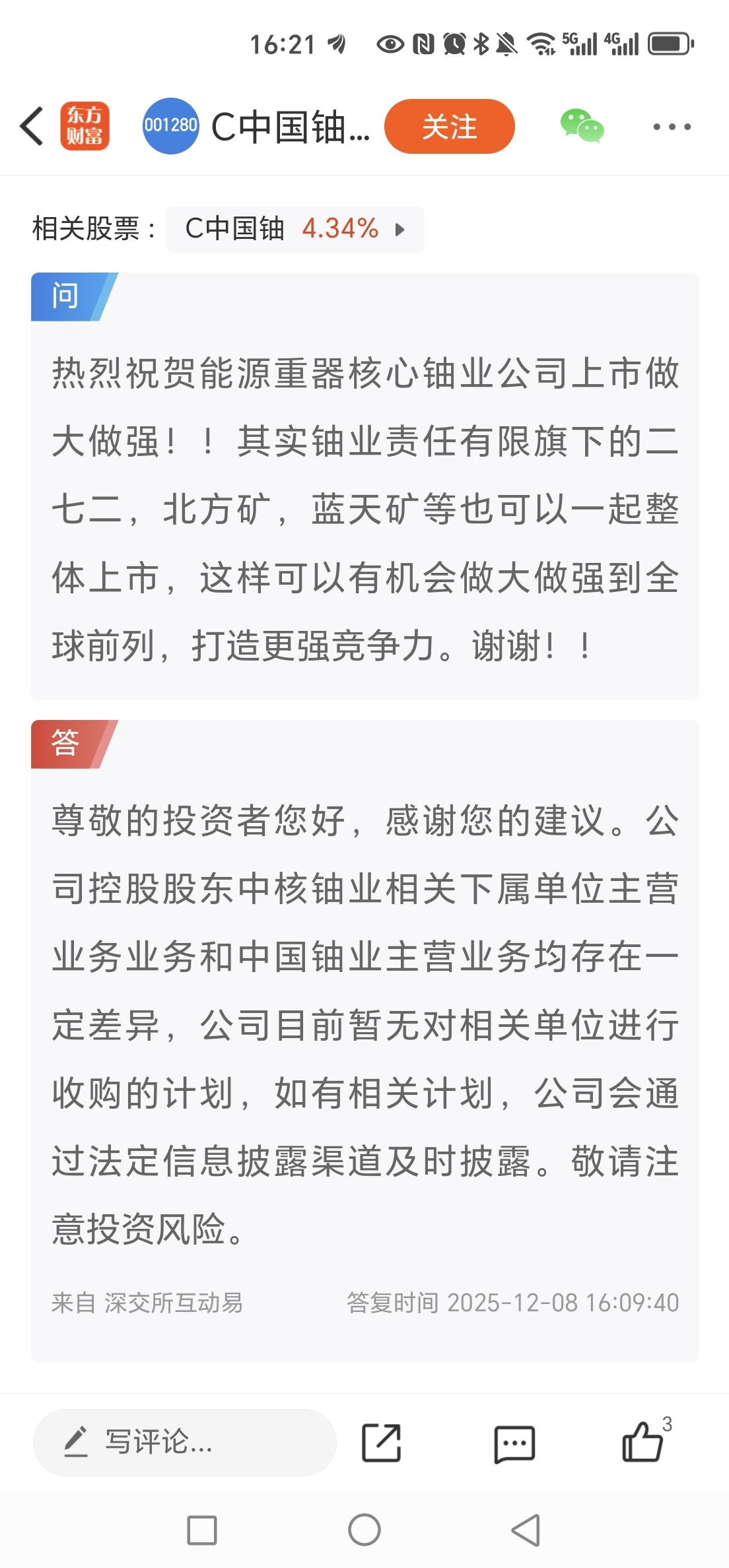 $C中国铀(SZ001280)$ 重大利好,暂无收购计划,以后有会说的