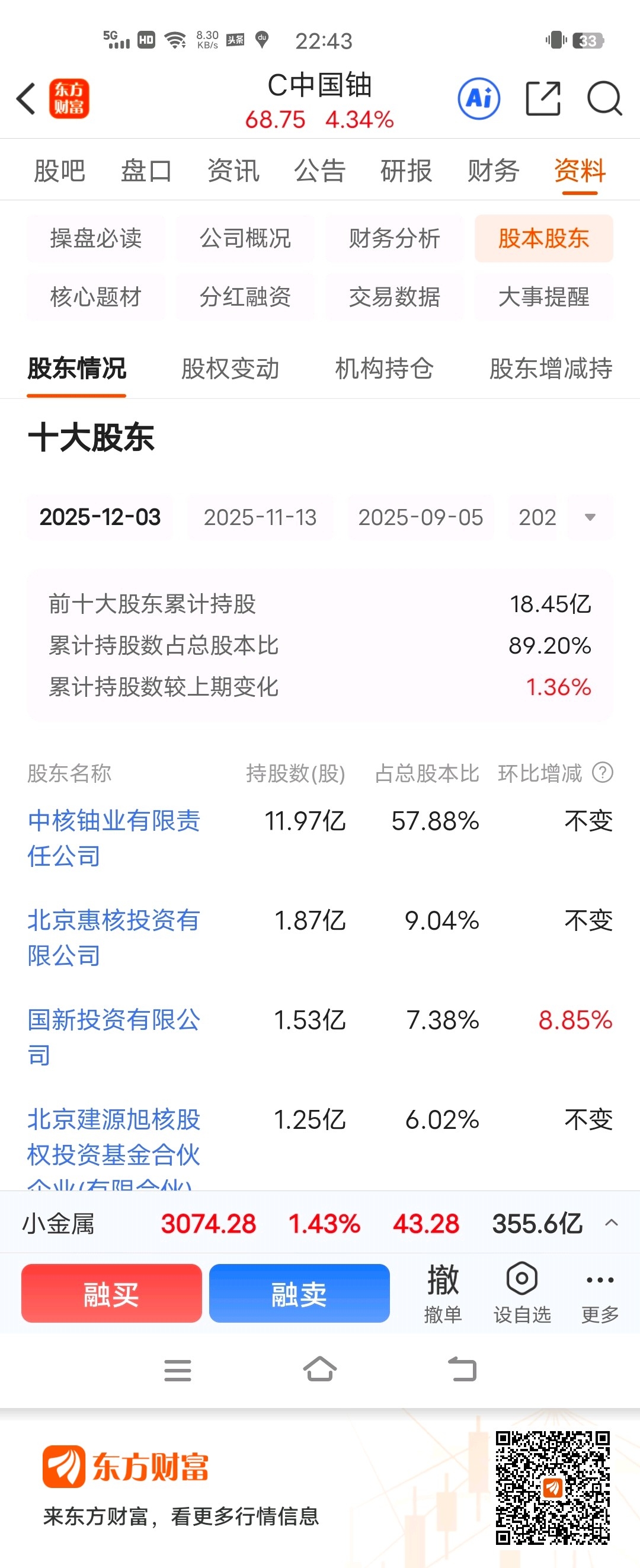 $C中国铀(SZ001280)$ 看十大股东(占89.2%),只有一个有限合伙的才有未来减持的可能,所以说所有的股份从上市当日起,基本被锁死!