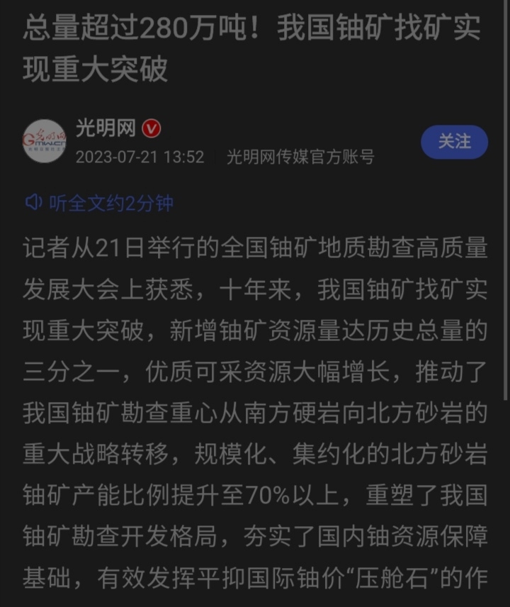 001280最大看点在于其独家垄断我国全部铀矿,而近年我国采用创新的从煤找铀和从油找铀方法探明铀储量居然全球第一!今年001280用独创技术使得其单个铀矿产能提升10倍的同时成本大幅下降!凭借革命性的开采技术和全球第一的铀(主要是低品味)储量,001280极大概率几年后成为全球第一大的铀生产商!铀矿是核威慑的基石,也是大国间较量的重要筹码!当下咱们国家用的铀七成得从国外进口.