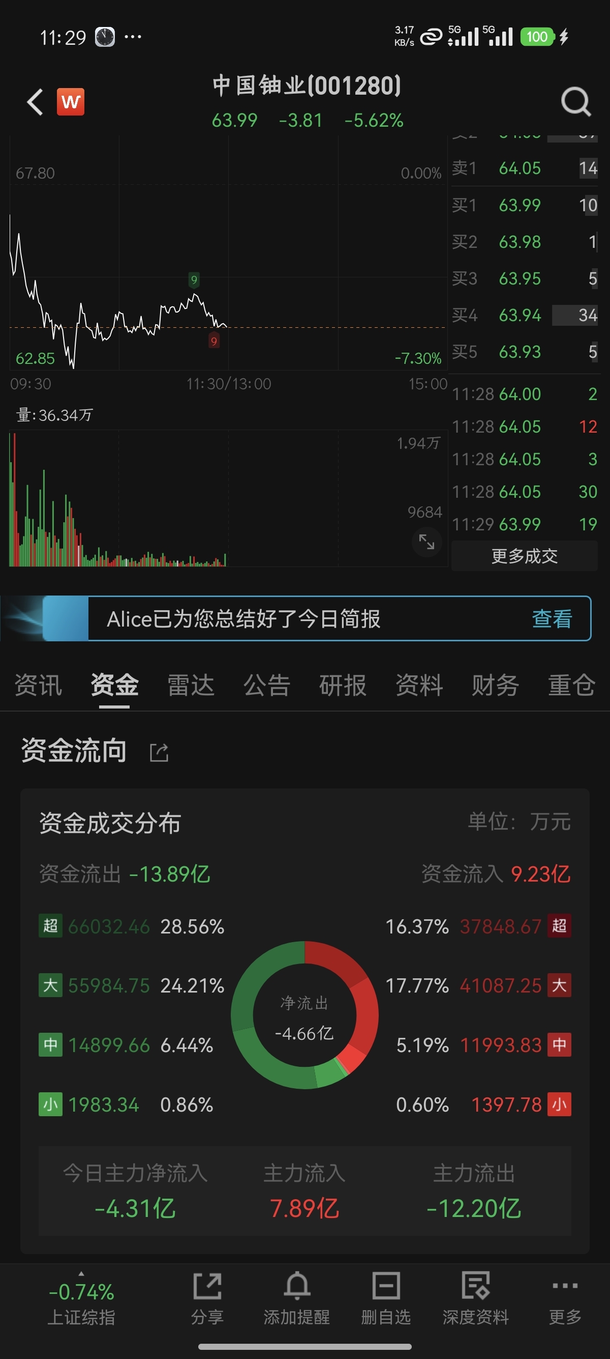 $中国铀业(SZ001280)$ 主力都跑了四个多亿