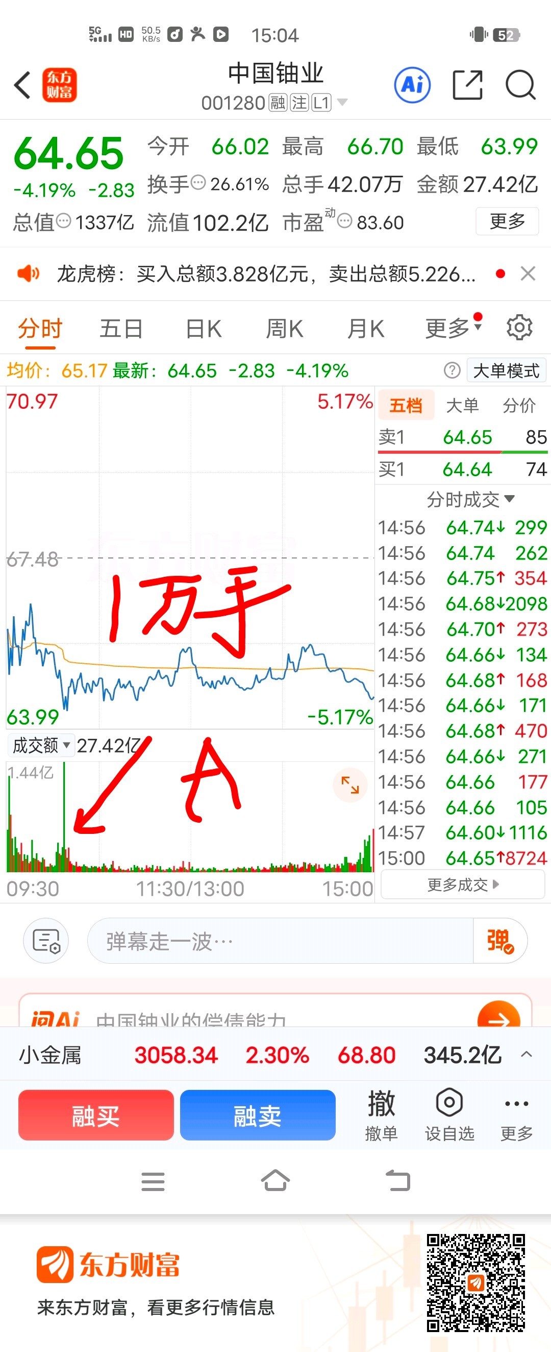 $中国铀业(SZ001280)$ 收盘价64.65,再看看万手哥的价格——64.56,人工雕琢的痕迹太明显!如此,后面就完全不用担心了。