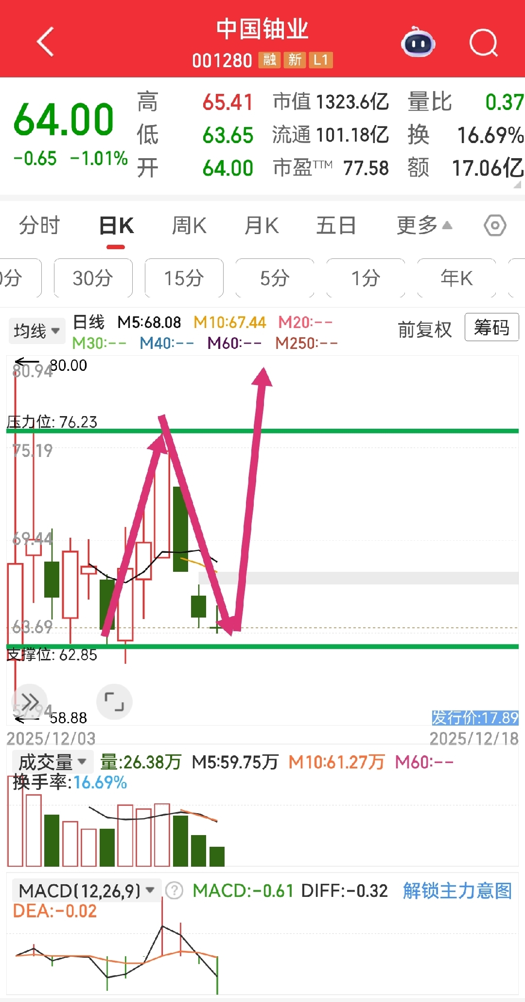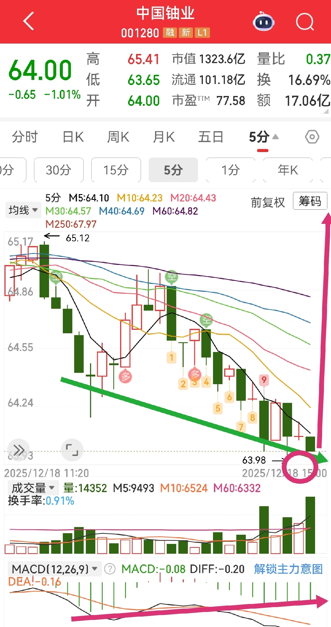 $中国铀业(SZ001280)$ 股价运行在智能撑压线之间,冲击压力位76.23元遇阻回落,回抽到智能撑压线的支撑位附近寻求支撑!持续下跌引发5分钟k线图,股价和macd出现下跌背离,后市对应会有5分钟级别的反弹