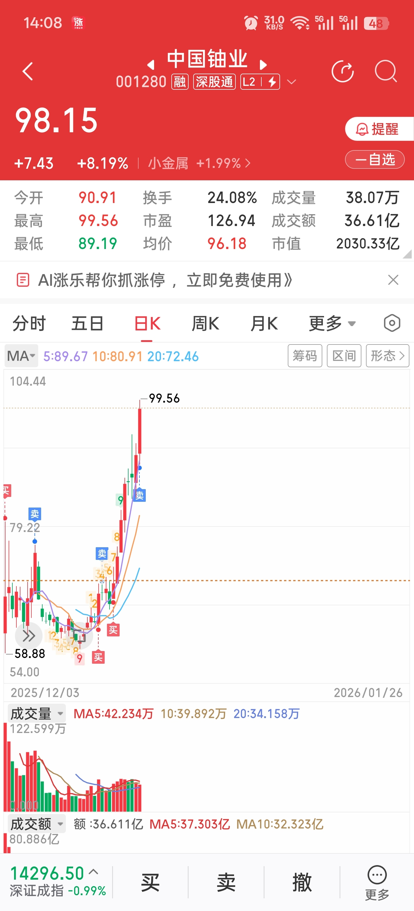 $中国铀业(SZ001280)$ 98.15出了 明天低开再进 高开就不要了