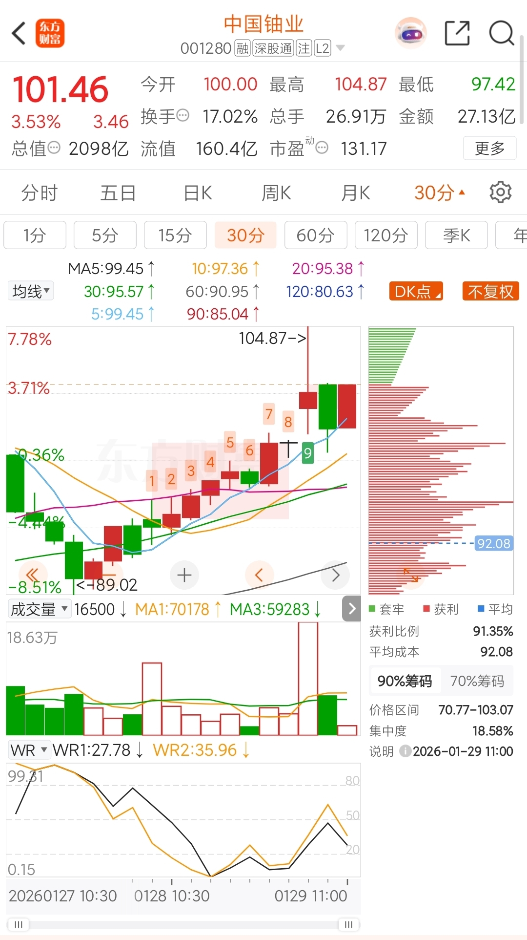 $中国铀业(SZ001280)$ 完美的曲线,日线缺口补完,再补30分钟线缺口,只能说主力牛逼#强势机会#