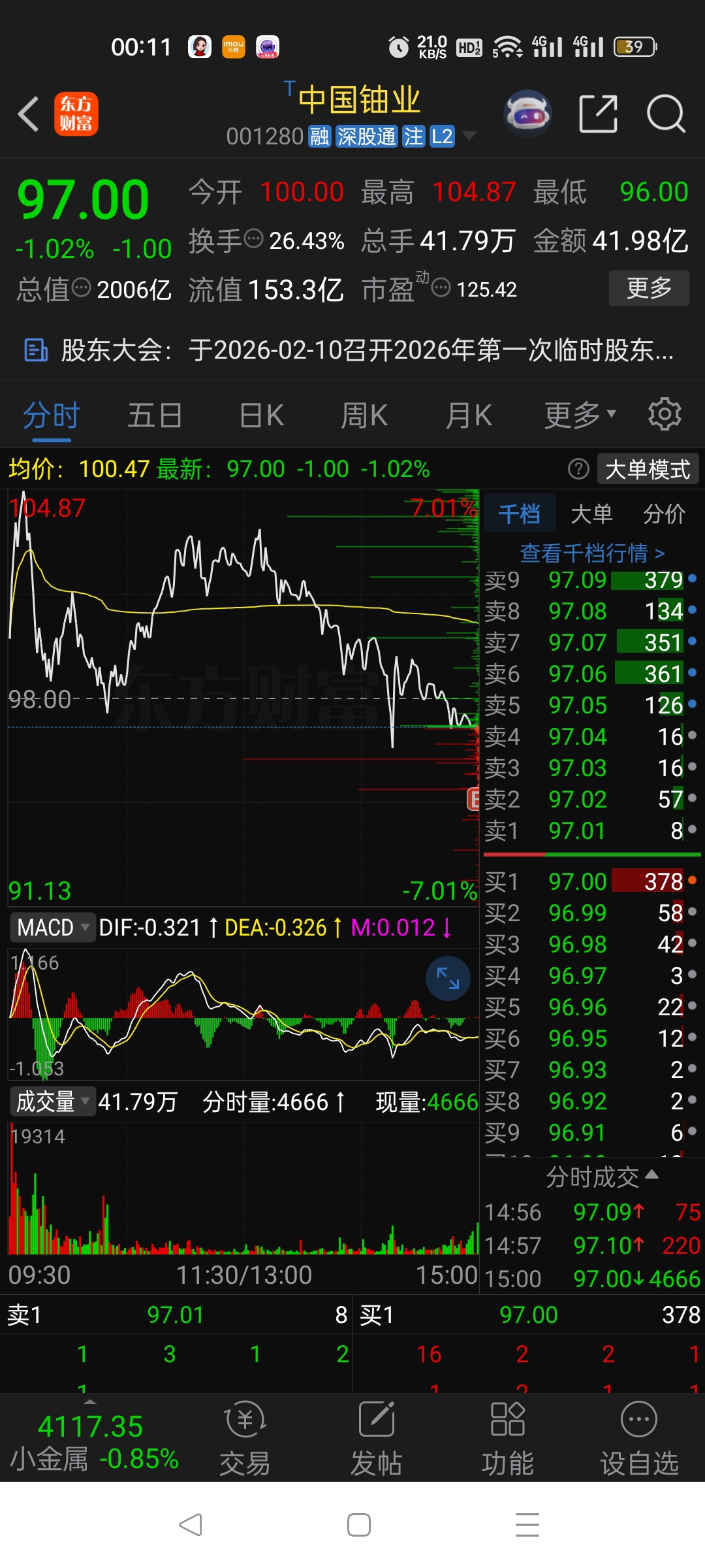 $中国铀业(SZ001280)$ 我就买了1手,就买崩了,明天大概率跌停