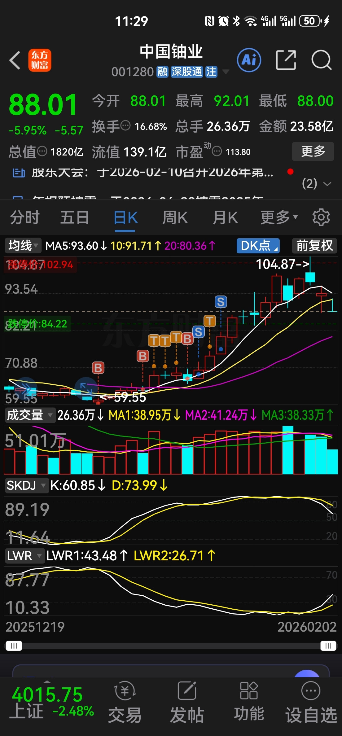 $中国铀业(SZ001280)$ 早卖8天,一股少赚近30。还能回到65以下吗?我耐心等待