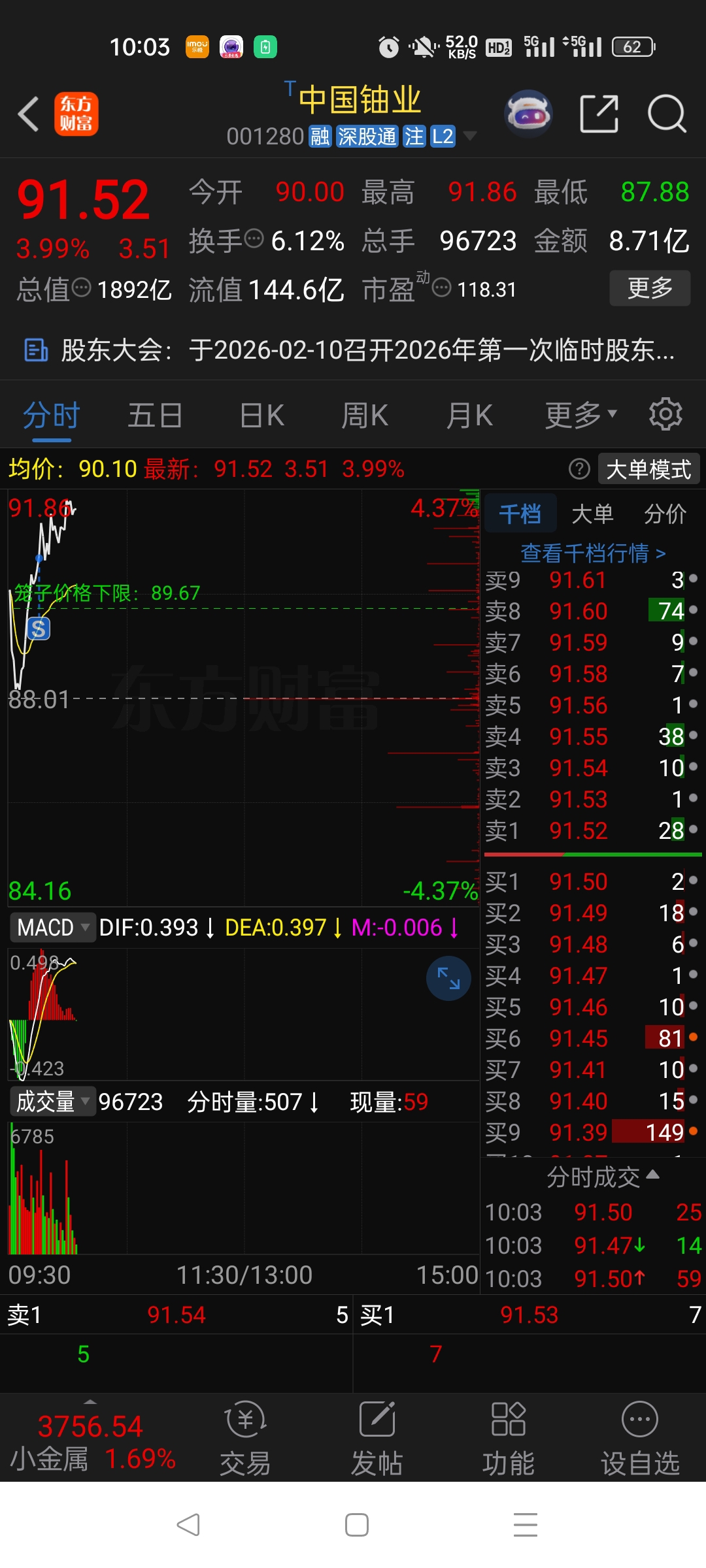 $中国铀业(SZ001280)$ 卖飞了,下午跌到85再接回来