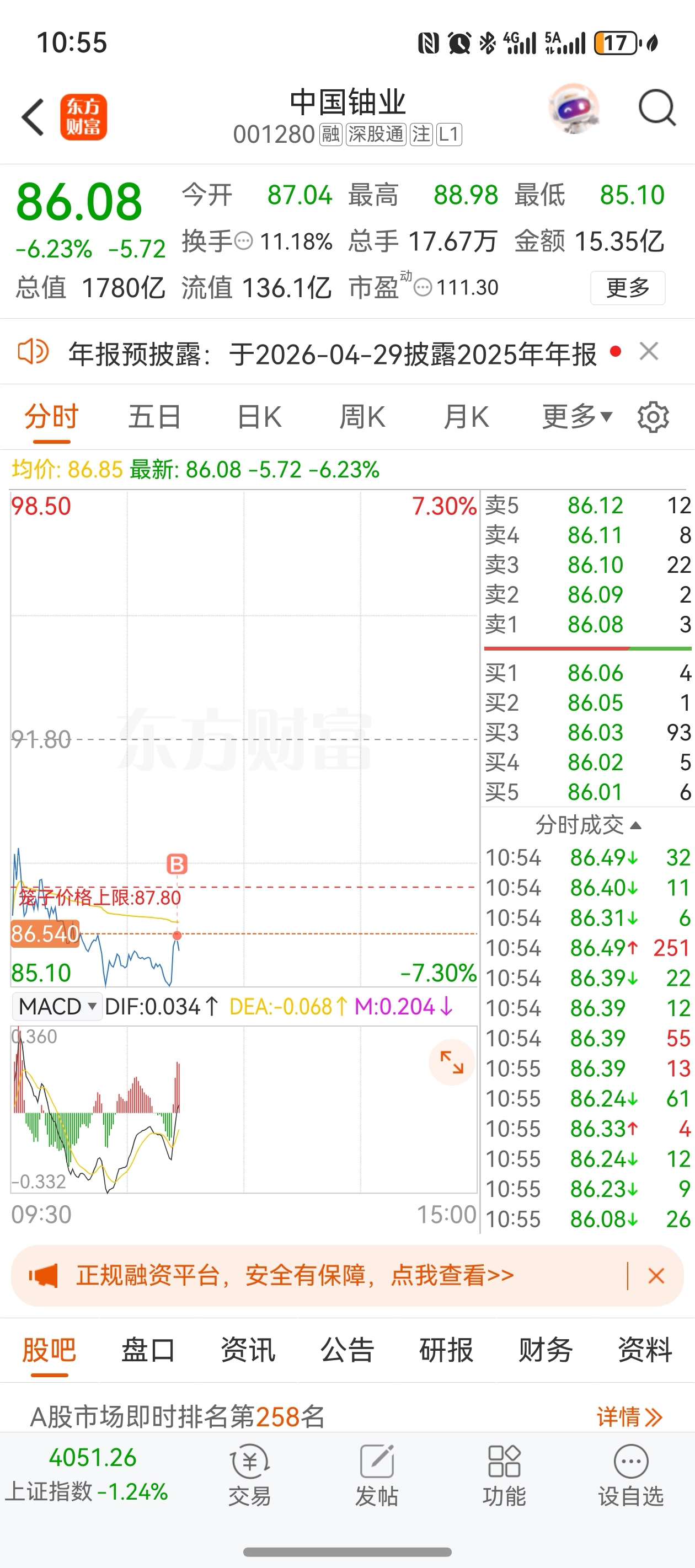$中国铀业(SZ001280)$ 挂的84一直不下去撤单一下,买在一个小峰上面了