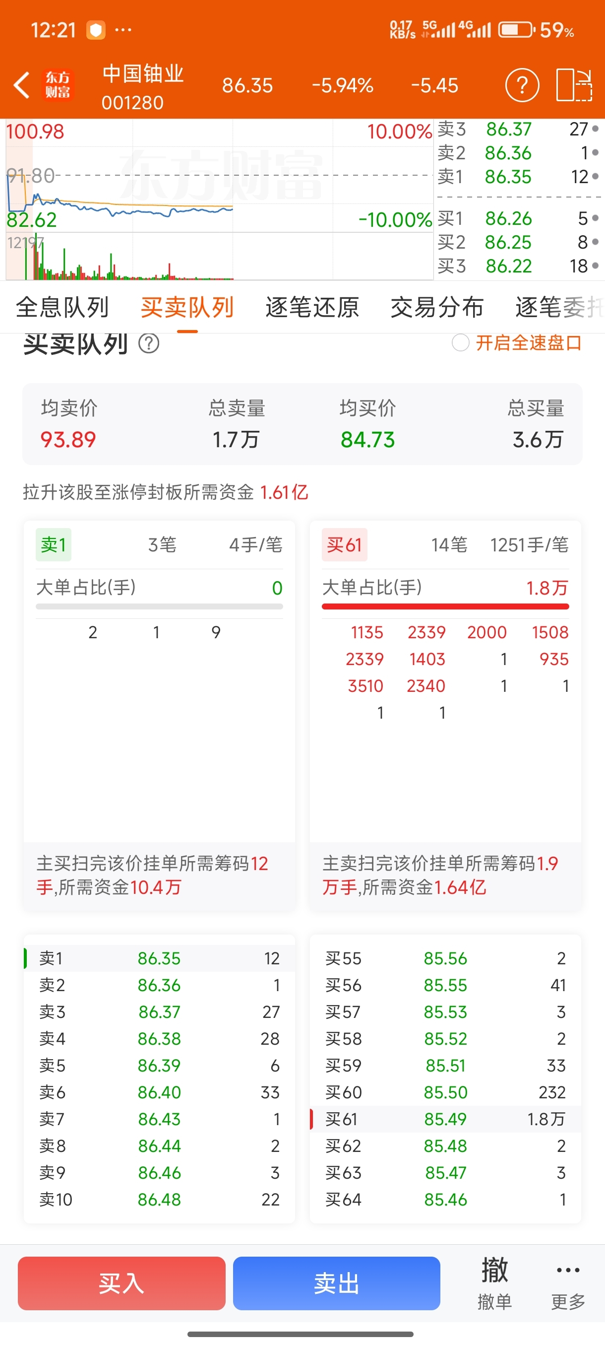 $中国铀业(SZ001280)$ 下边85.49是真买单还是假买单