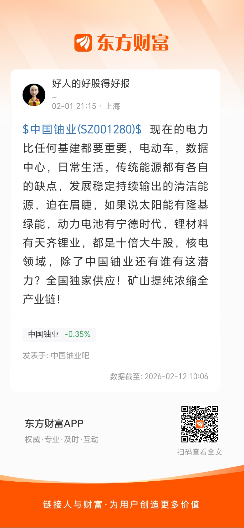 $中国铀业(SZ001280)$ 现在的电力比任何基建都要重要,电动车,数据中心,日常生活,传统能源都有各自的缺点,发展稳定持续输出的清洁能源,迫在眉睫,如果说太阳能有隆基绿能,动力电池有宁德时代,锂材料有天齐锂业,都是十倍大牛股,核电领域,除了中国铀业还有谁有这潜力?全国独家供应!矿山提纯浓缩全产业链!