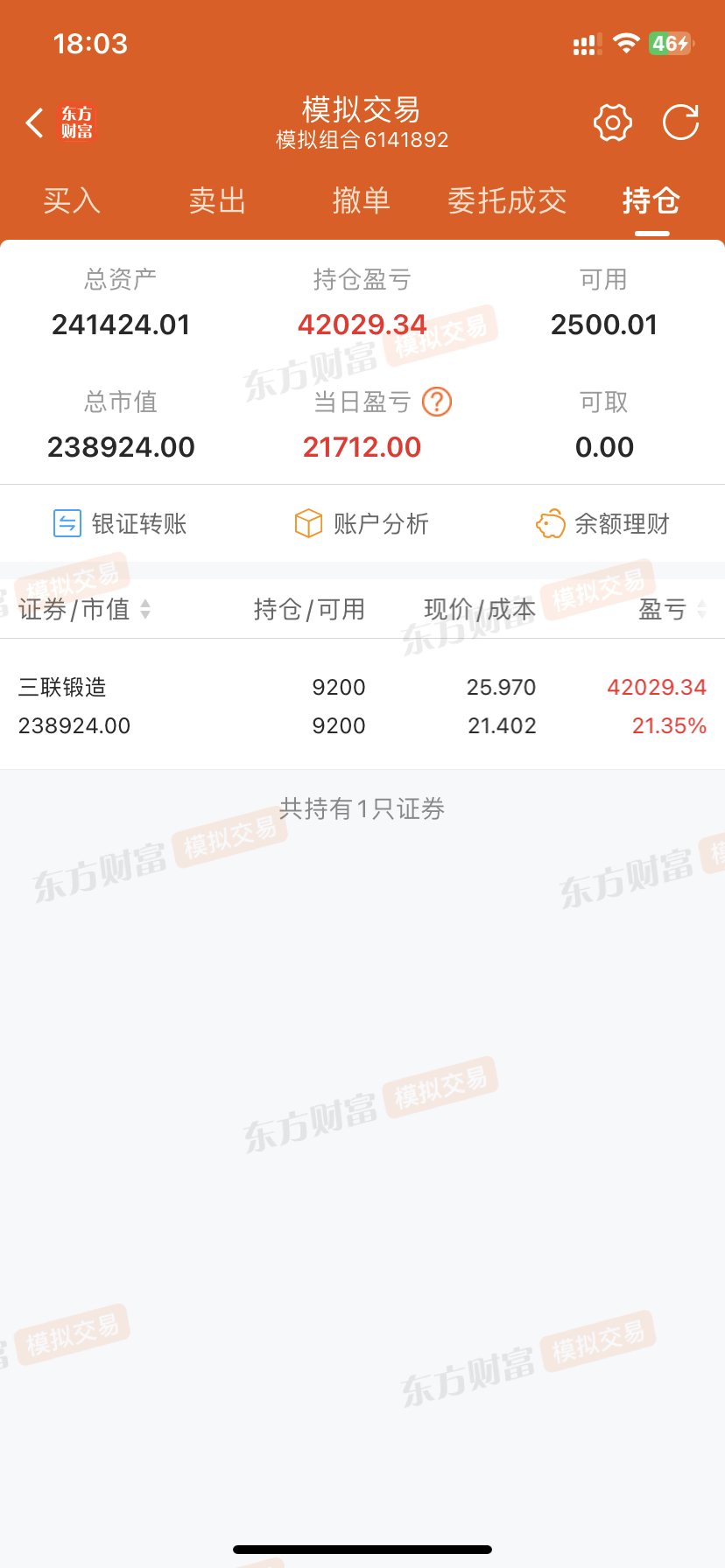 $三联锻造(SZ001282)$ 好消息,买入20万全仓,我自己都没时间看,坏消息,这是模拟盘