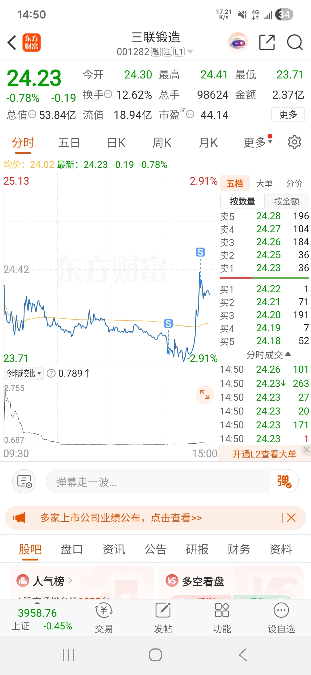 $三联锻造(SZ001282)$ 哎,玩了几天挣了二十块,走了